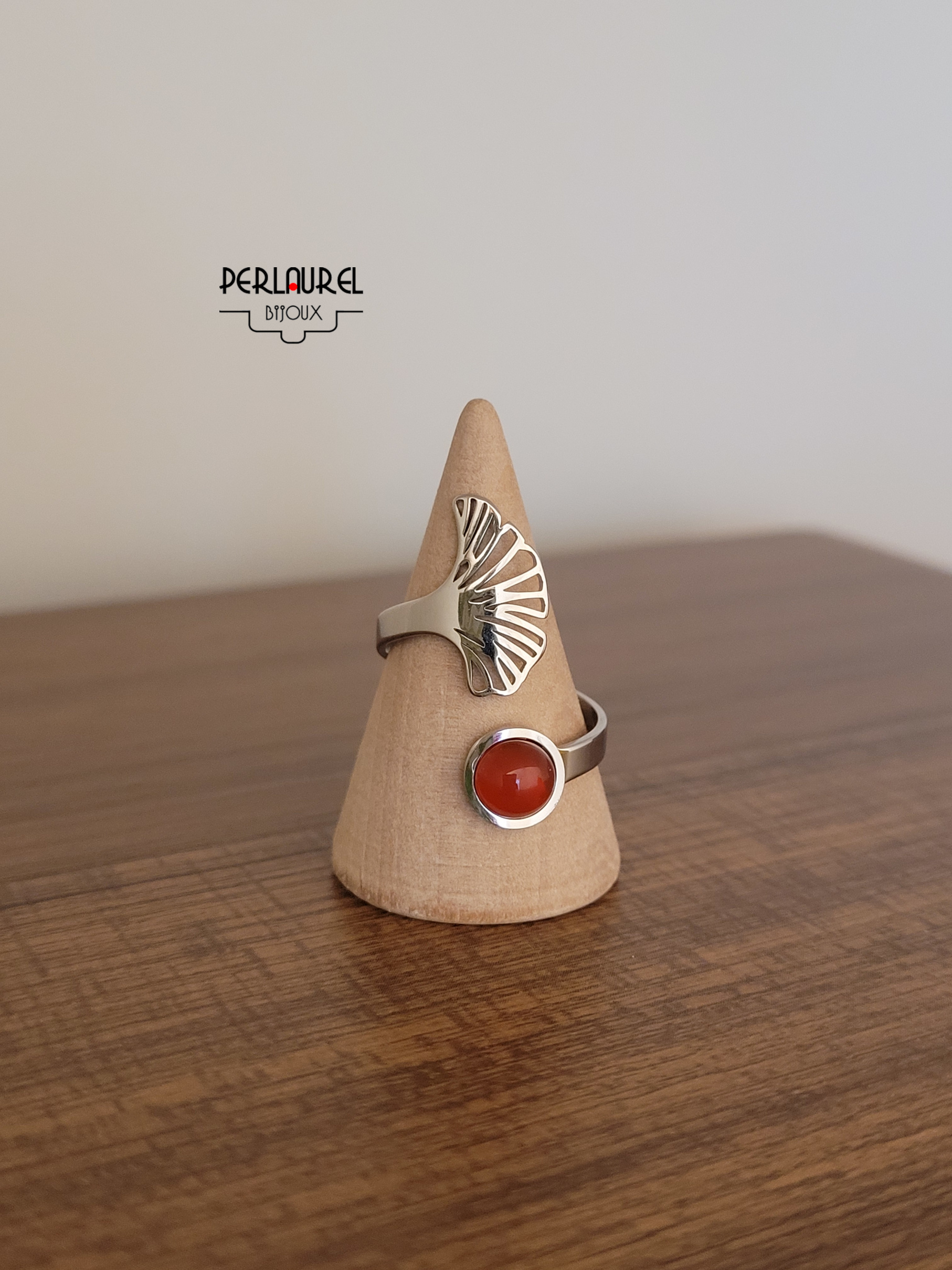 Bague réglable en acier inoxydable argenté avec cabochon en pierre gemme.