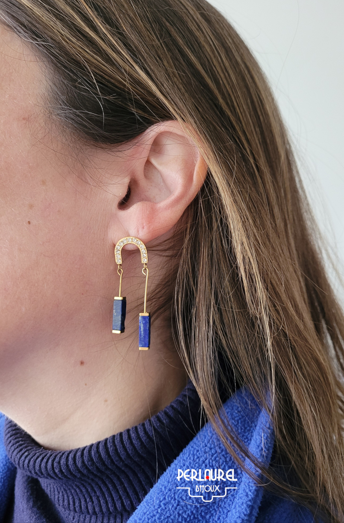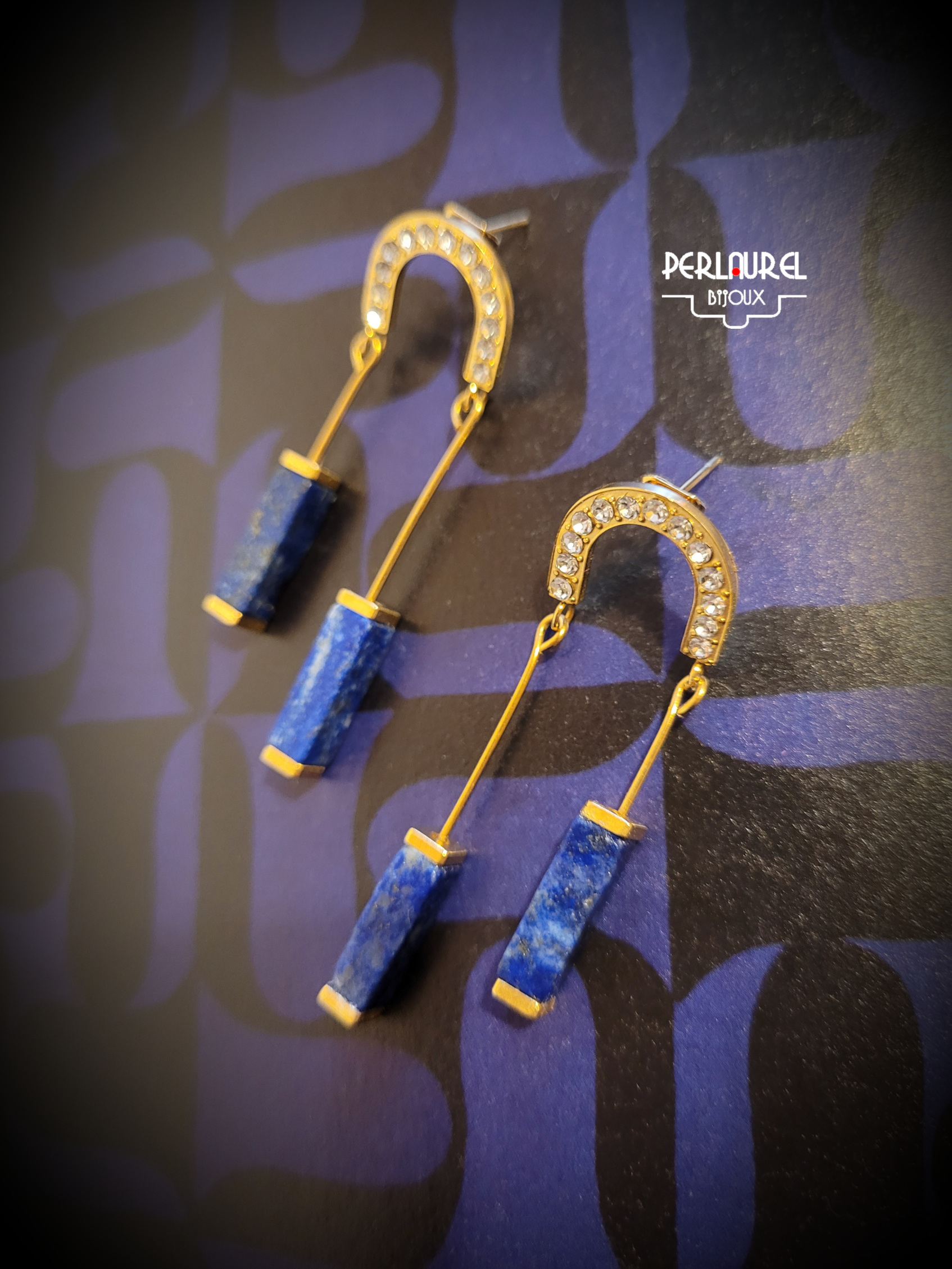 Clous d’oreilles strass en acier inoxydable 316L doré, perles tubes en lapis lazuli et perles rondelles dorées à l’or fin.