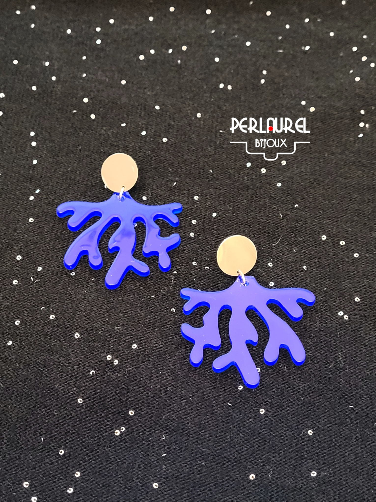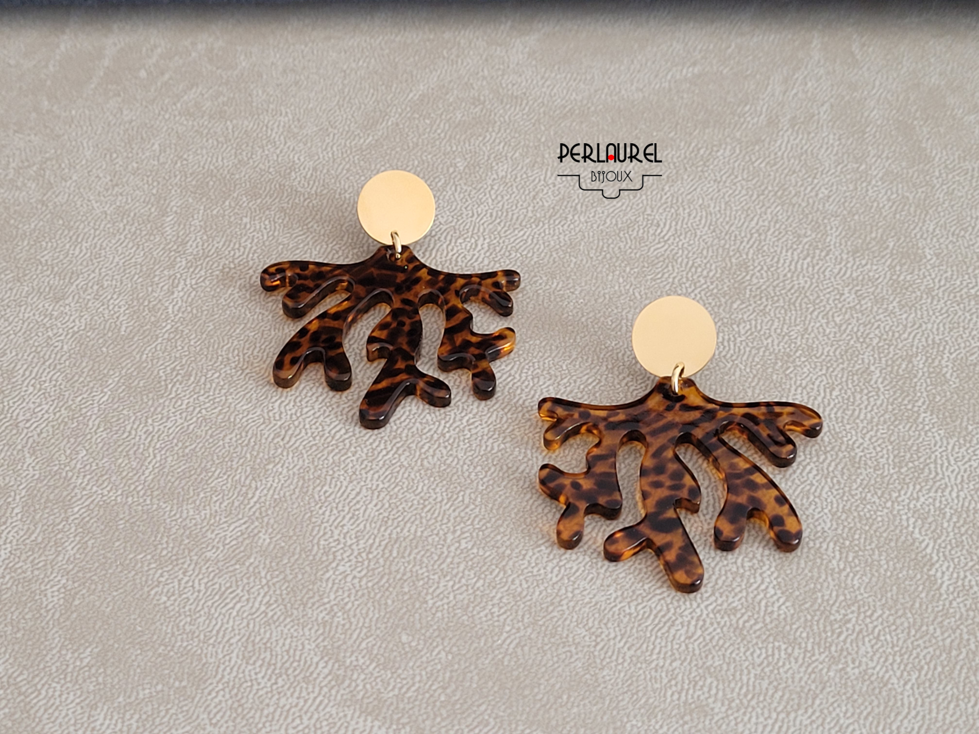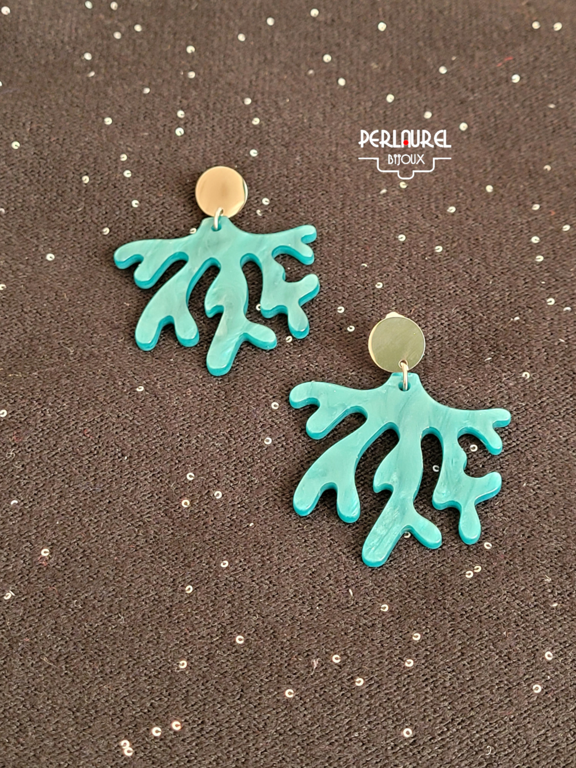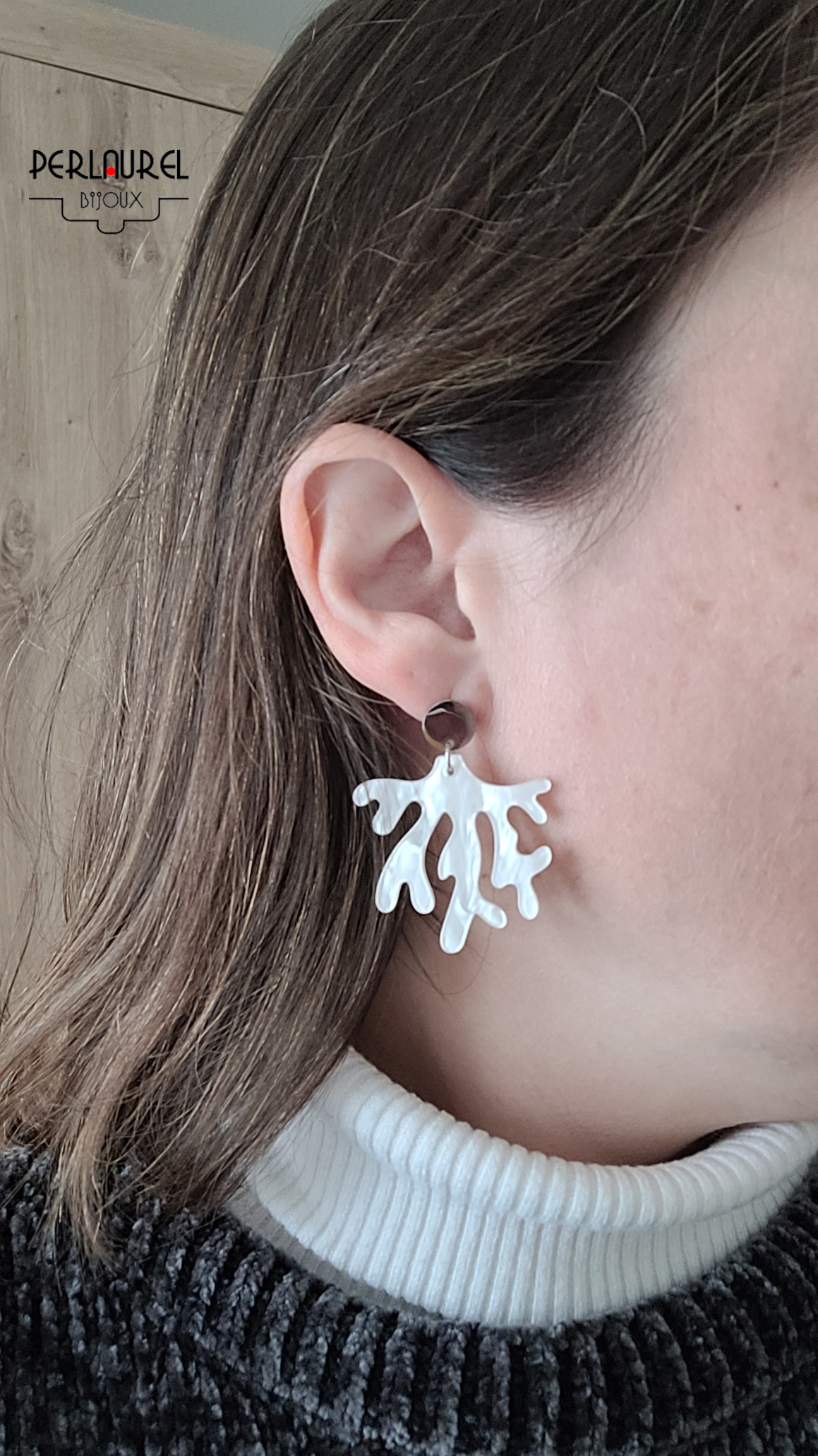 Boucles d’oreilles composées de pendentifs en acrylique motif corail et de clous d’oreilles ronds en acier inoxydable 316L doré ou argenté.